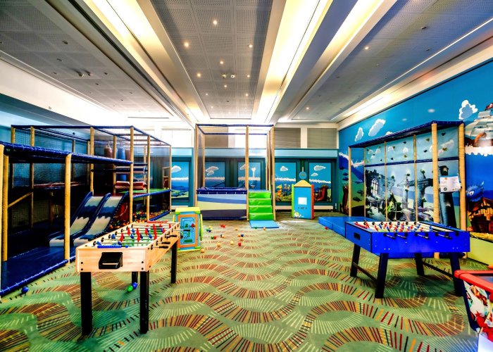 Indoor-Spielplatz „Galion“ für Kinder von 2 bis 12 Jahren. Spiel- und Abenteuerlandschaft mit Rutsche, Bällebad, Trampolin, Kletterwand, Kicker, Lerncomputer, Videospiele und Spielsachen zur Verfügung.