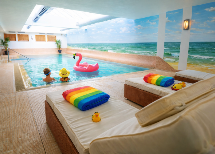 Der 450m² große Wellnessbereich des Hauses bietet neben einem Innenpool (Größe: 11 x 5m), drei Saunen, ein Dampfbad und einen Ruheraum.