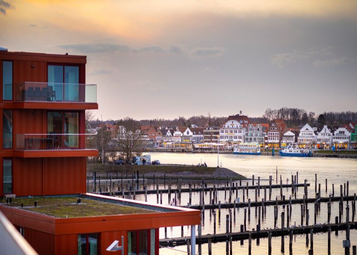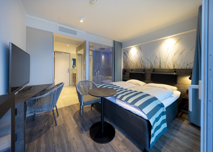 Doppelzimmer Superior mit Wasserblick: ca. 30 m², mit direktem Wasserblick, privates Dampfbad mit Doppelregendusche, WC, Wohnbereich mit Biokamin, Balkon, Kitchenette mit Mikrowelle und Nespressokapselmaschine und SAT-TV.