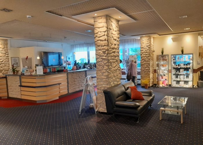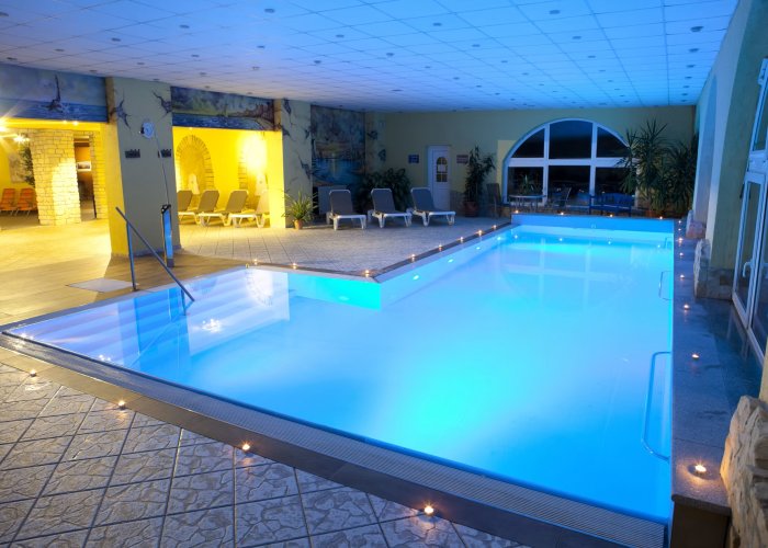 Zwischen den beiden Häusern 1 (Doppelzimmer Haus Brocken) und 2 (Doppelzimmer Haus Thale gegen Aufpreis buchbar) befindet sich ein Hallenbad, Liegeflächen im Innen- und Außenbereich sowie Saunabereich. Außerdem werden Massagen angeboten. Das Sportangebot umfasst Fitnessräume, Kegelbahnen, eine Sporthalle mit Beachvolleyball, einen Tennis- und Beachmintonplatz, Tischtennis und Minigolf. Die kleinen Gäste sind auf dem hoteleigenen Spielplatz willkommen. Das WLAN ist im Preis inbegriffen.