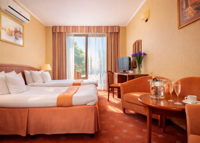 Doppelzimmer Premium Lux (min. 2 Erw./max. 2 Erw. + 1 Kind) sind bei gleicher Ausstattung geräumiger und verfügen über einen separierten Schlafbereich.